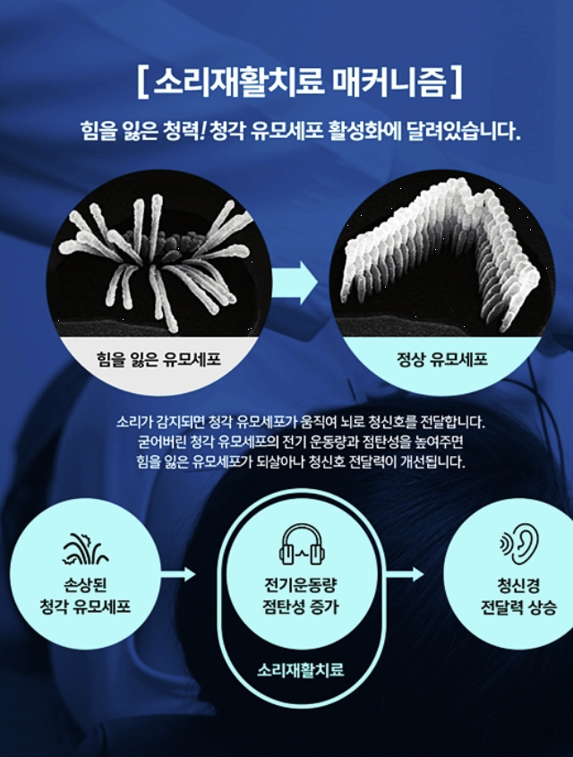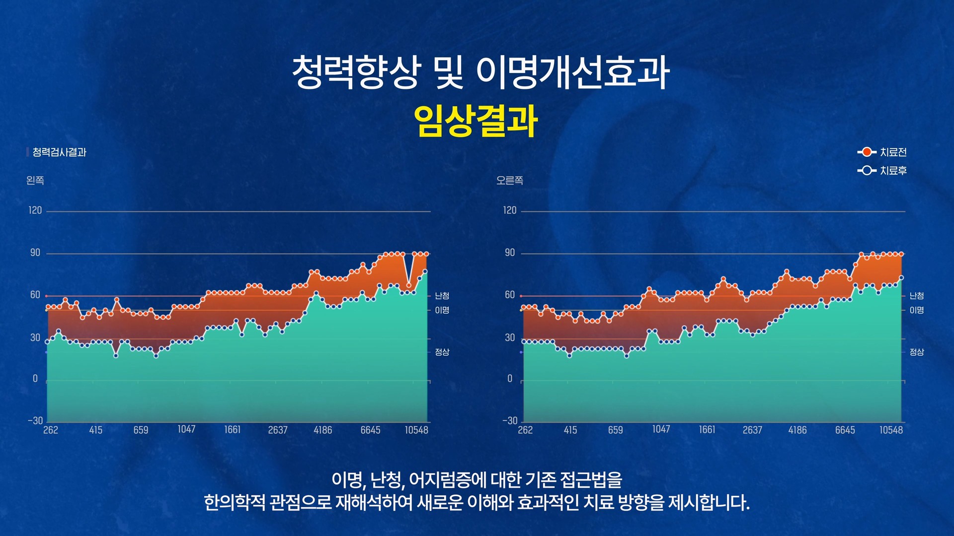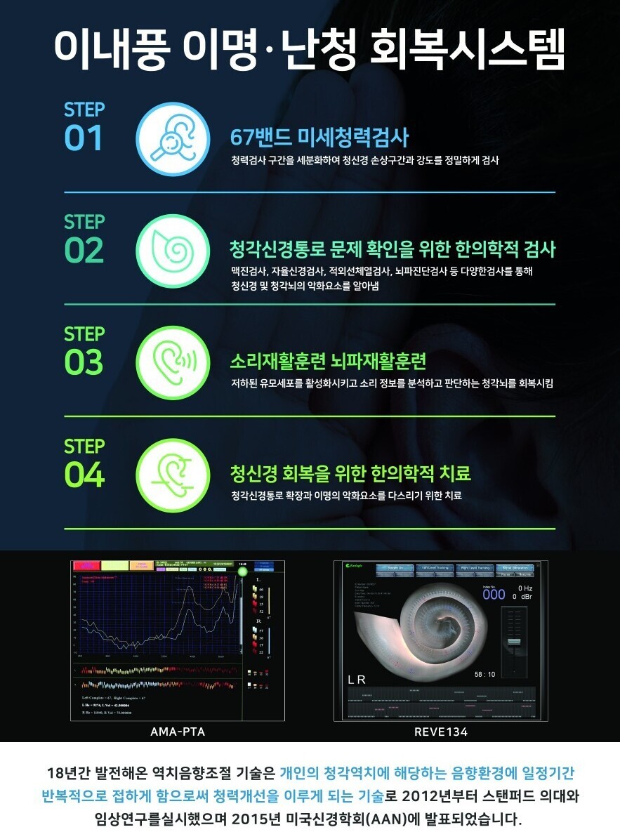 AMA-PTA (미세청력검사기기)검사결과를 바탕으로 환자 개개인마다 맞춤 소리를 별도로 제작하고, 손상된 말초 청각세포를 자극하여 중추 청각기능까지 개선시킴으로써 정상적인 청각기능을 회복시켜 이명과 난청을 개선하는 효과가 있습니다.