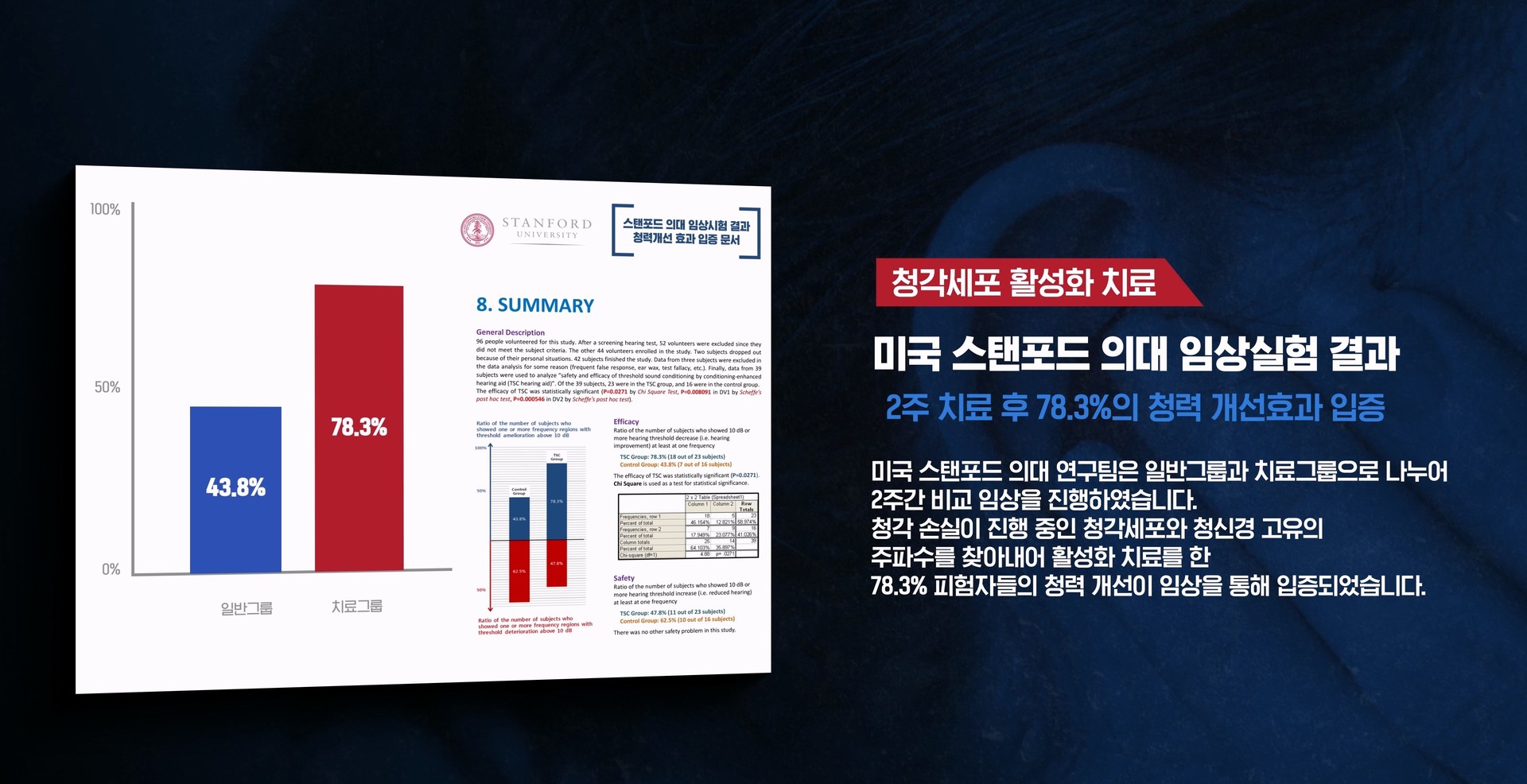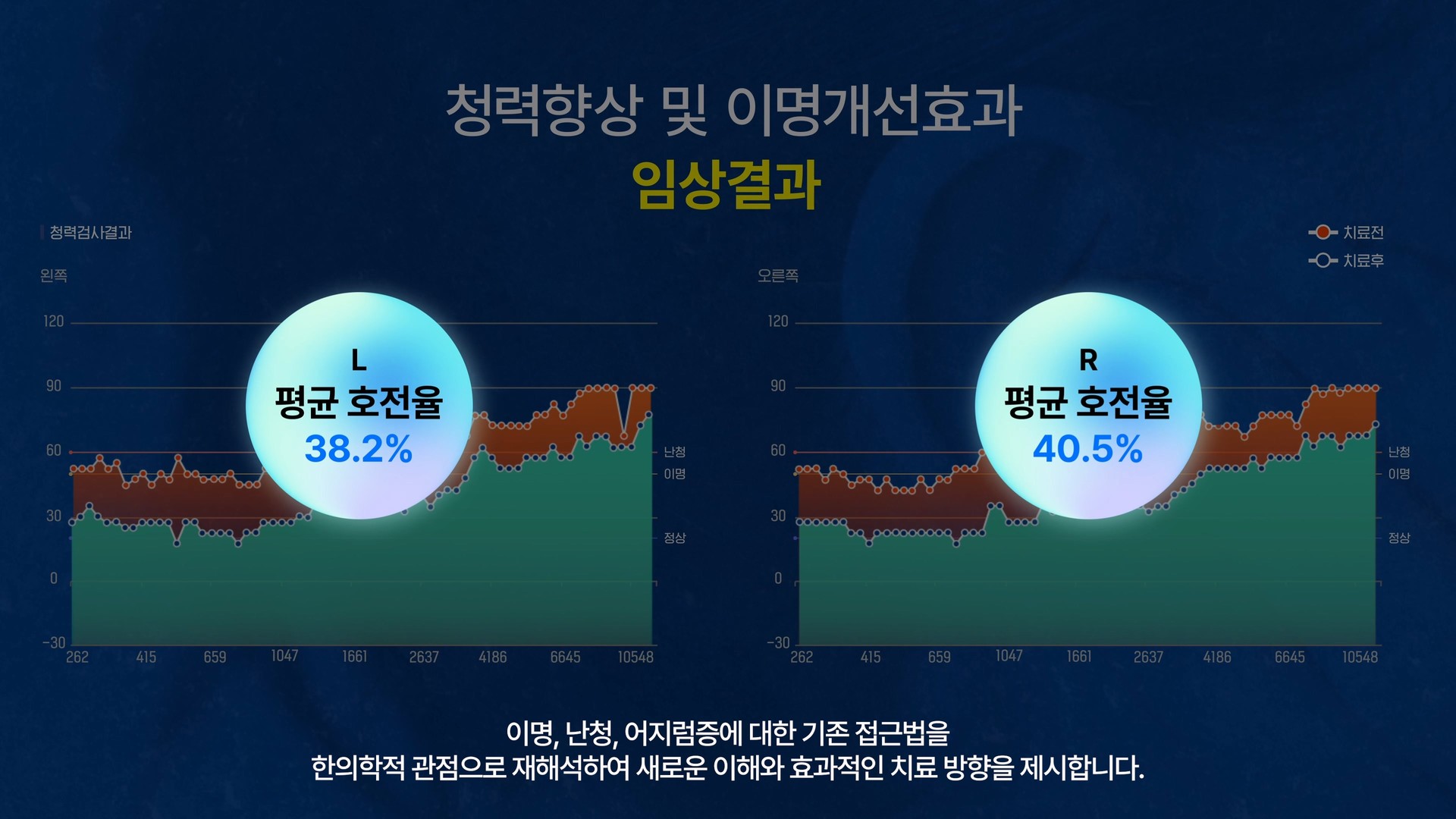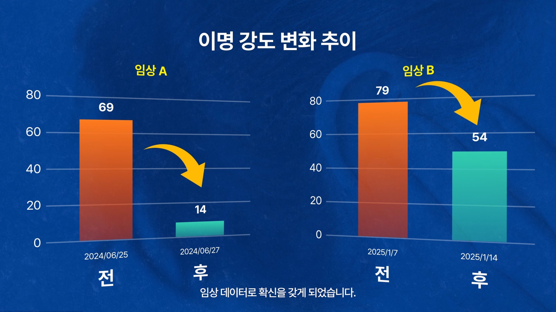 AMA-PTA (미세청력검사기기)검사결과를 바탕으로 환자 개개인마다 맞춤 소리를 별도로 제작하고, 손상된 말초 청각세포를 자극하여 중추 청각기능까지 개선시킴으로써 정상적인 청각기능을 회복시켜 이명과 난청을 개선하는 효과가 있습니다.